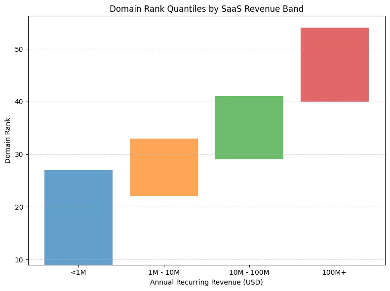 After compiling hundreds of data points from both disclosed revenues and correlated Domain Rank scores, we grouped SaaS companies into revenue bands and measured the 25th and 75th percentiles for each group.