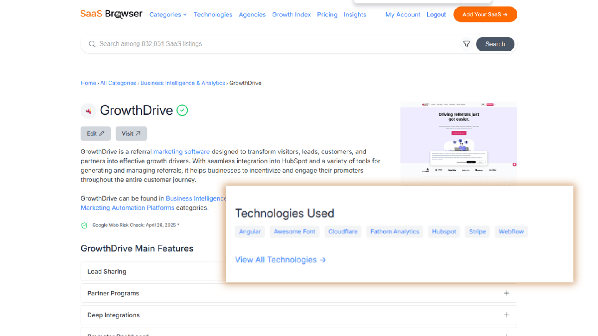 This kind of niche analysis would normally take hours of manual research. SaaS Browser does it in seconds. That insight helps you determine if the product deserves a premium valuation multiple or needs a discount for market crowding.