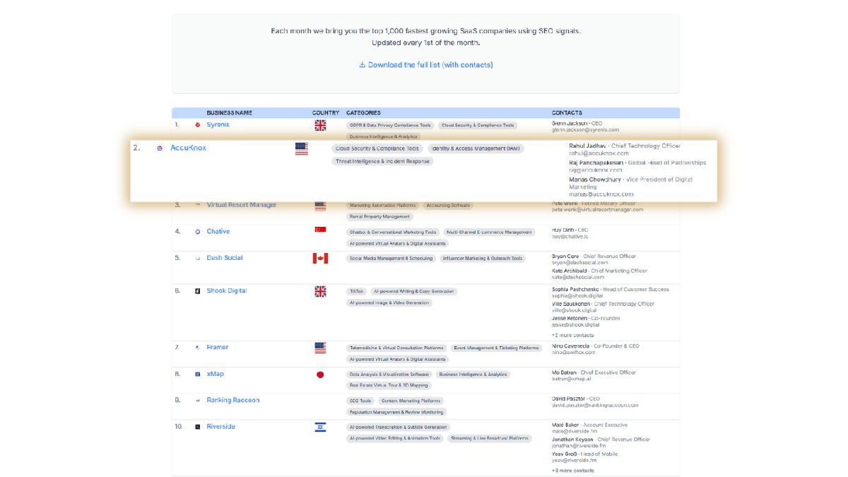 • Role-based tags (CEO, CTO, CMO) to help you contact the right person